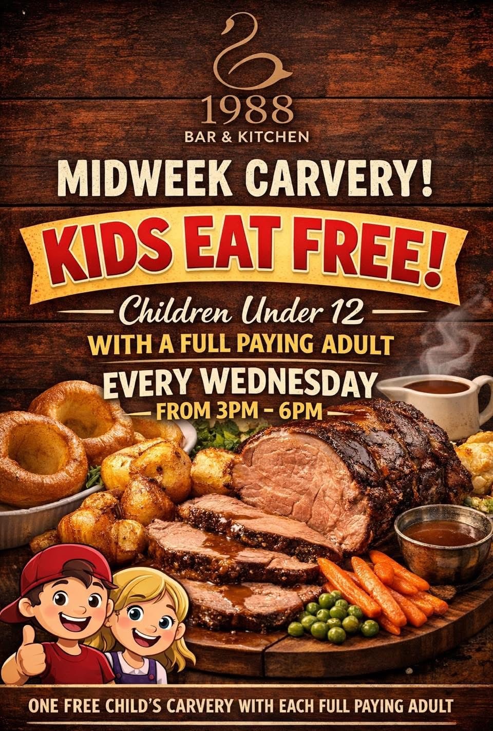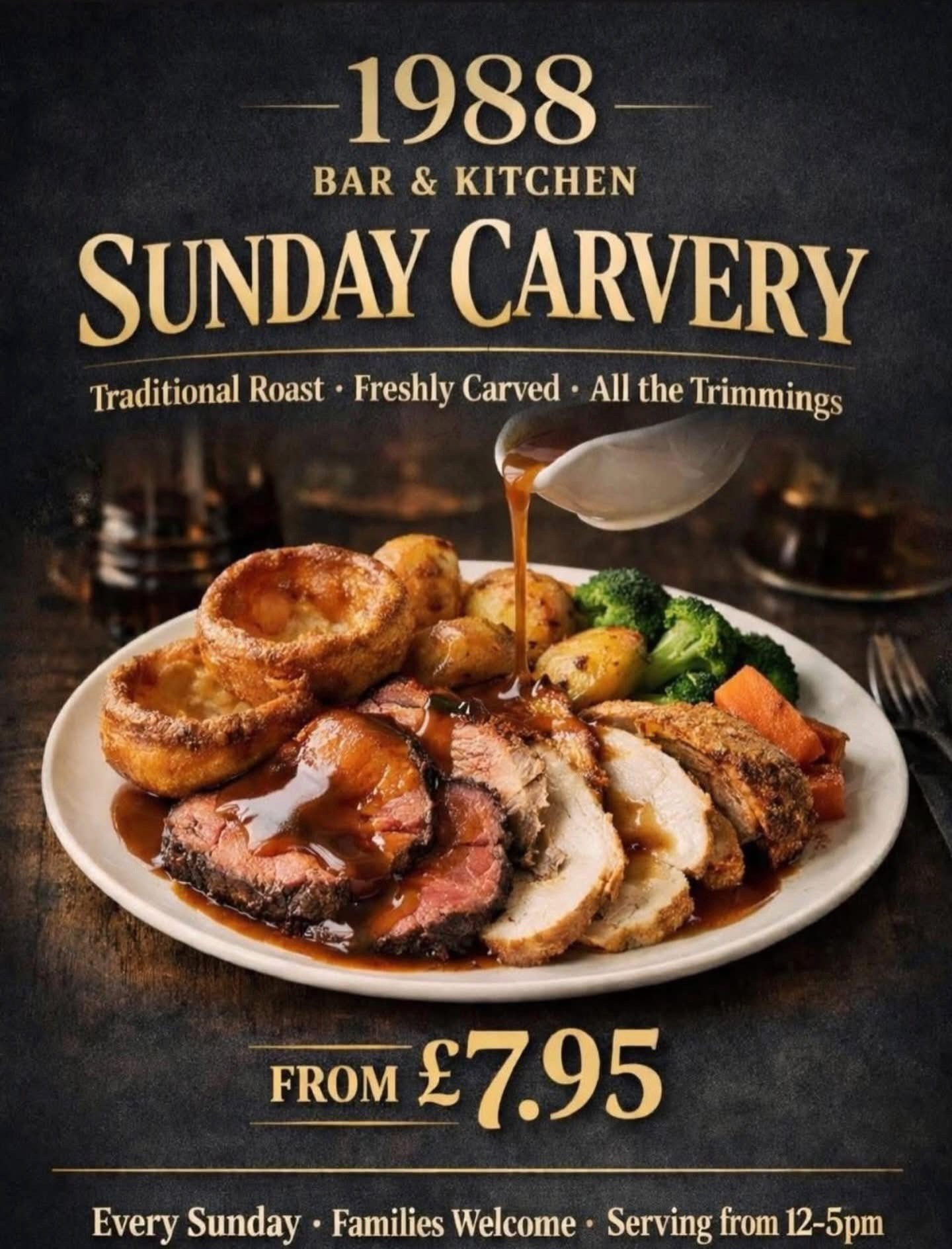 There’s nothing quite like a Sunday Carvery, and at 1988 Bar & Kitchen it’s all about good quality. Gather the family, bring the grandparents and enjoy a laid-back Sunday meal where everyone can find something they love. From tender roasted meats to seasonal vegetables and classic extras, it’s the kind of meal that turns into a proper family catch-up — without anyone having to cook or wash up afterwards