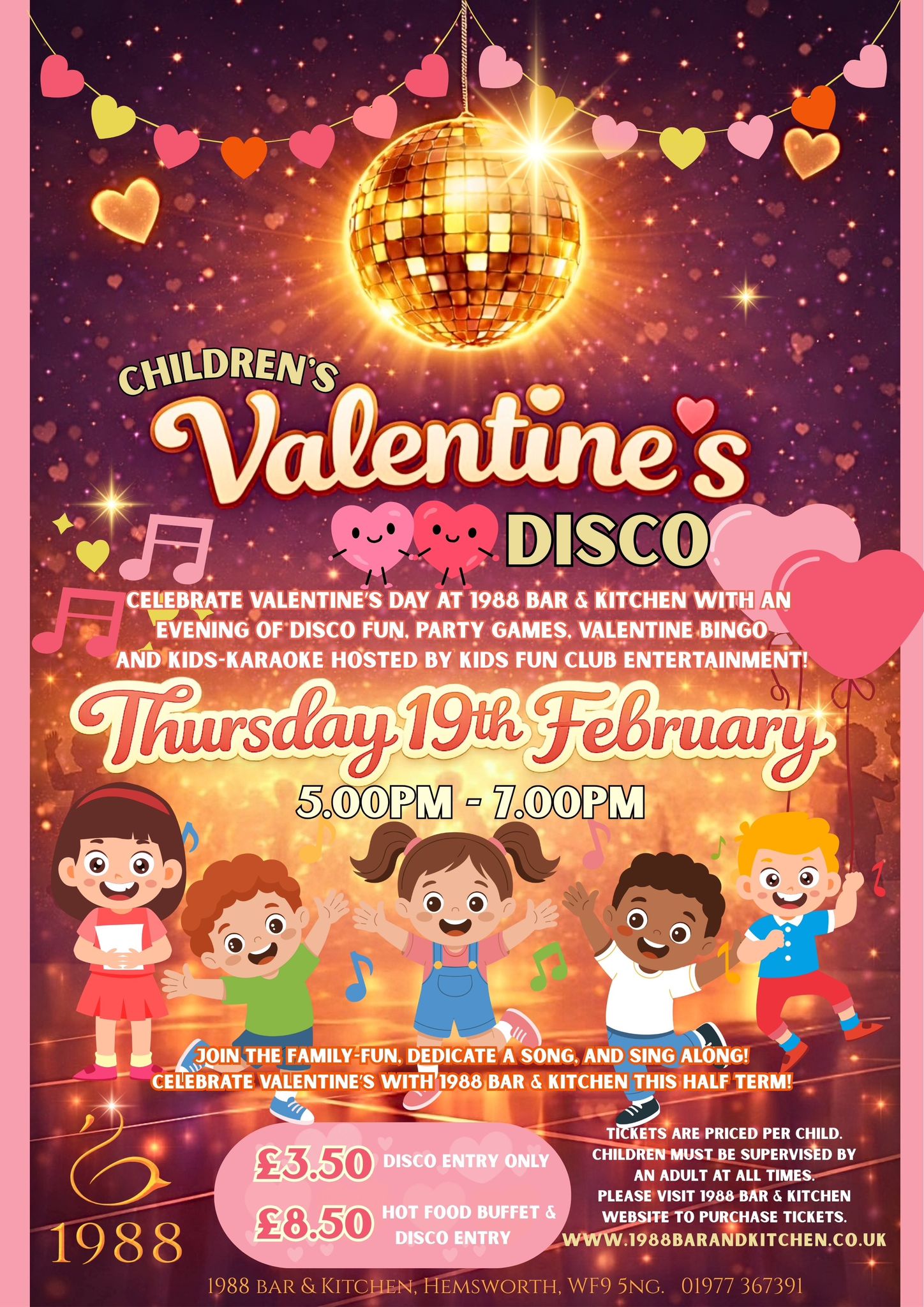 We’re bringing the fun to 1988 Bar & Kitchen this half term with our Children’s Valentine’s Disco! Join us on Thursday 19th February from 5:00pm – 7:00pm for a brilliant evening packed with music, dancing and lots of laughter. Hosted by Kids Fun Club Entertainment, this is the perfect event for families wanting something a bit different — with disco fun, party games, Valentine bingo and even kids karaoke.