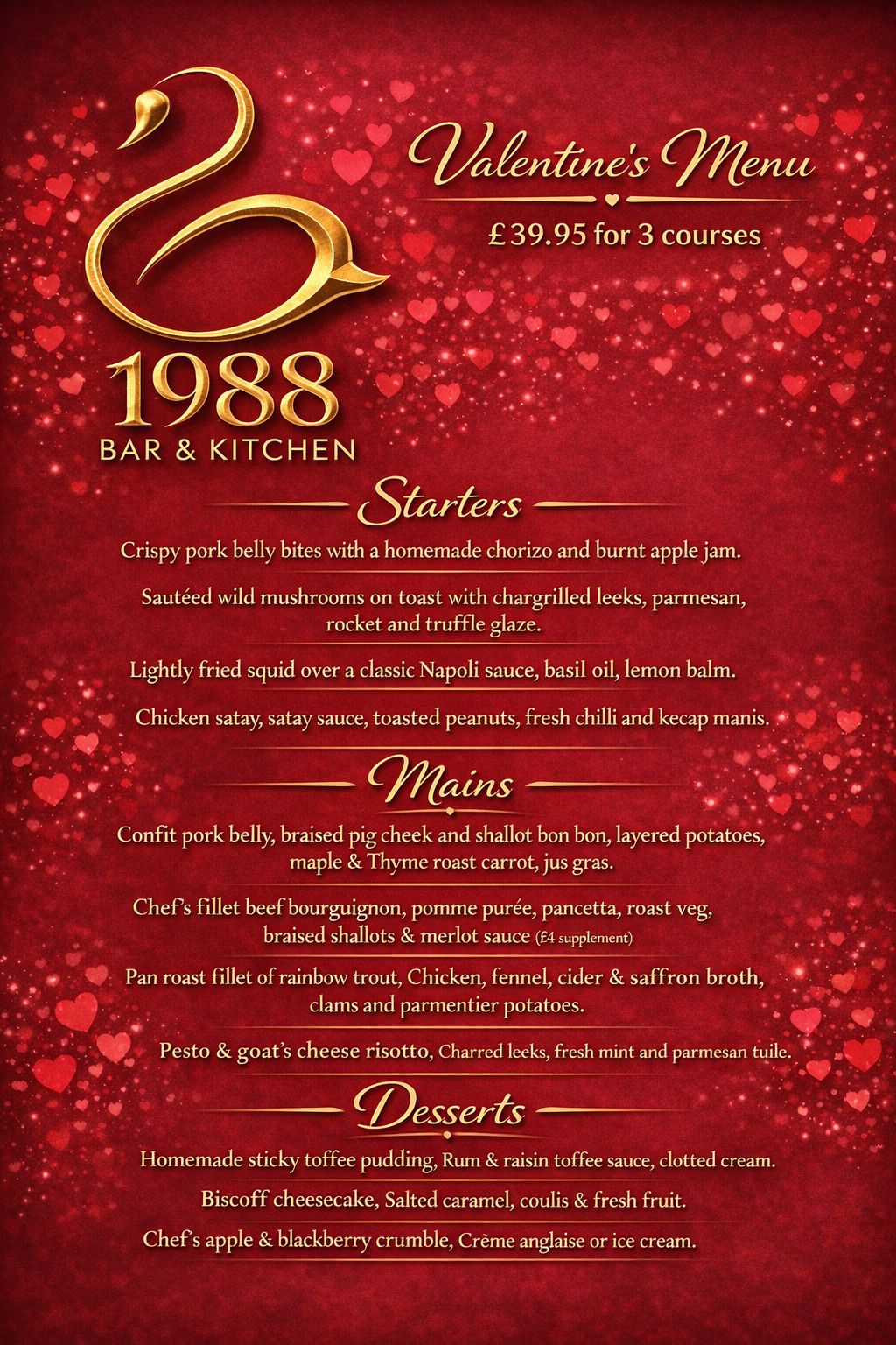 Looking for a relaxed and romantic way to celebrate Valentine’s Day? Join us at 1988 Bar & Kitchen for an evening of great food, a welcoming atmosphere and quality time together. Whether it’s a special date night, a surprise treat, or simply a chance to enjoy something a little different, our Valentine’s event is all about good flavours, great service and a warm setting that feels comfortable from the moment you walk in.